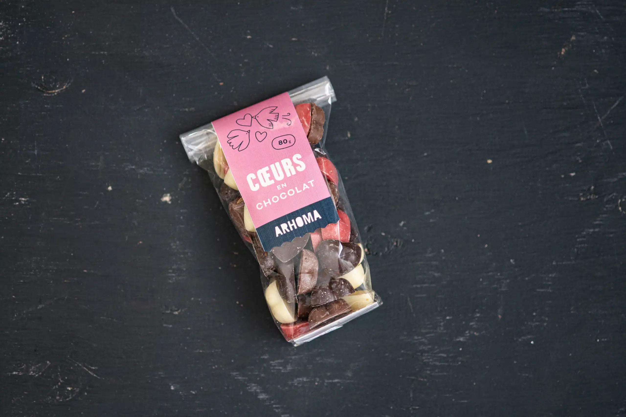 Offrez un petit sachet de cœurs en chocolat faits main, composé de quatre variétés exquises :